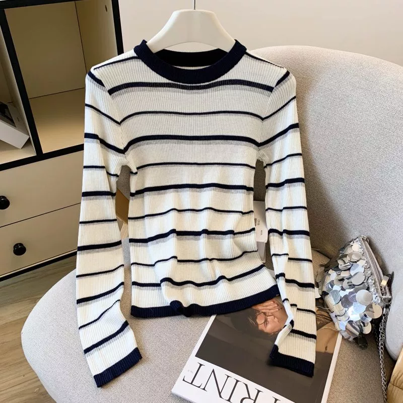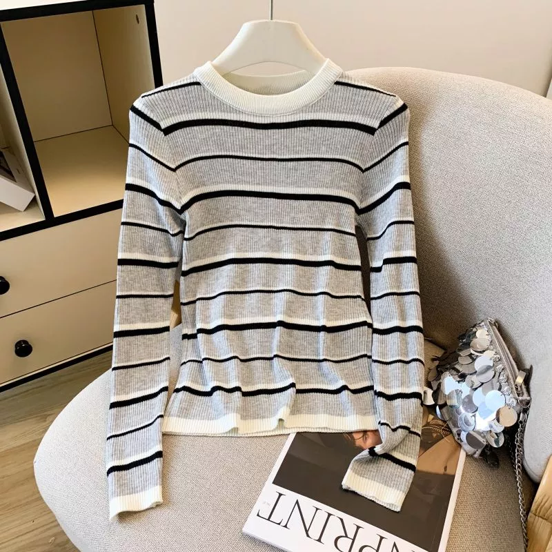 Maglia A Righe Grigia Con Maniche Lunghe Elastiche Stile Casual Chic CF55676