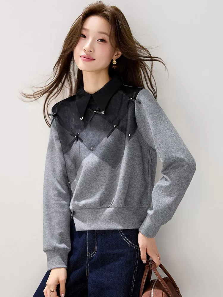Felpa Grigia Con Colletto Nero E Fiocchi Con Perle Stile Chic Casual CF55742