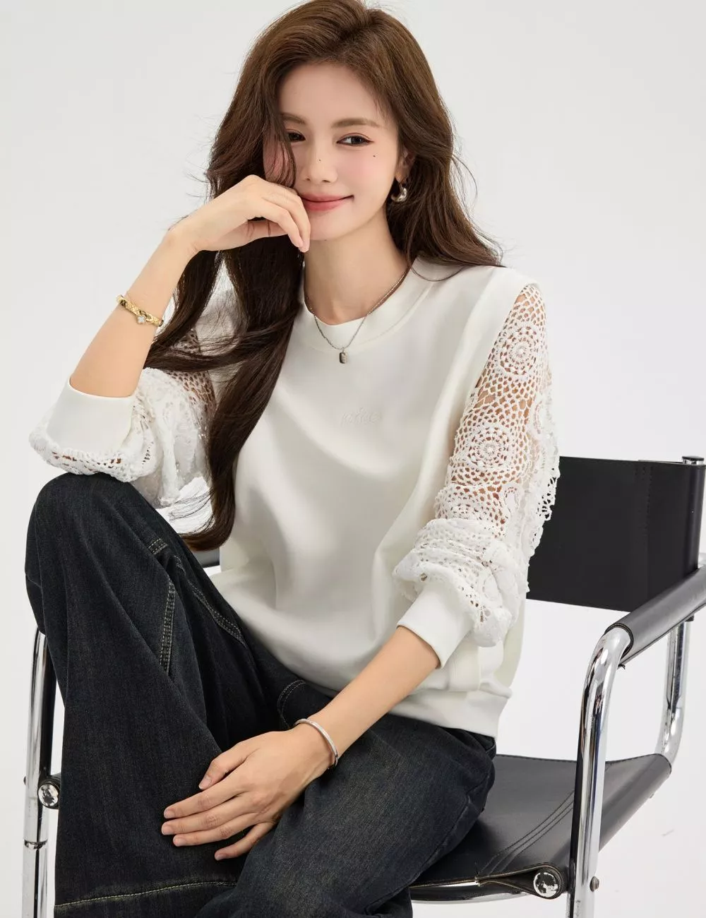 Felpa Bianca Elegante Con Maniche In Pizzo All’Uncinetto E Girocollo CF57386