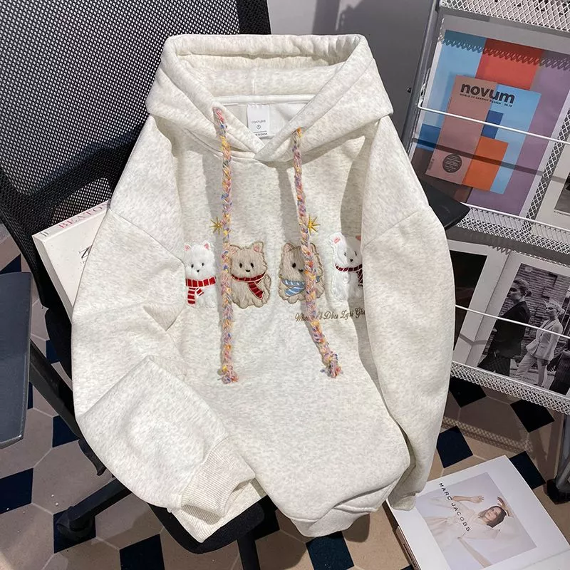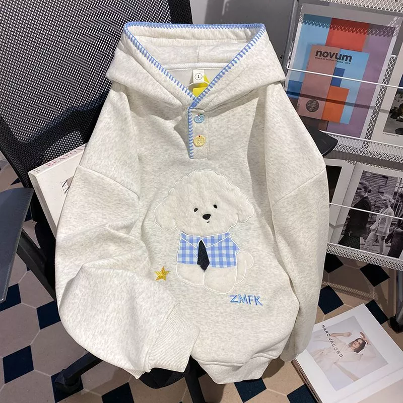 Felpa Avorio Calda Con Cappuccio Ricamo Cane Bottoni Colorati Stile Soft CF58768