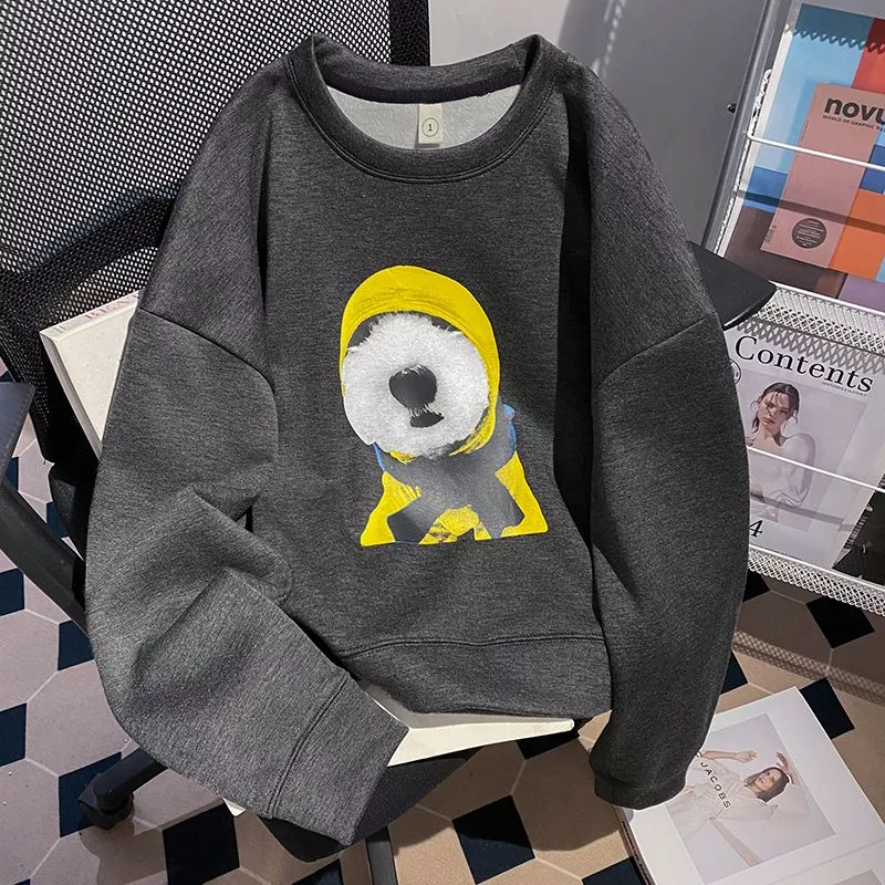 Felpa Grigio Scuro Calda Morbida Con Stampa Cane Cappuccio Giallo Casual CF58769