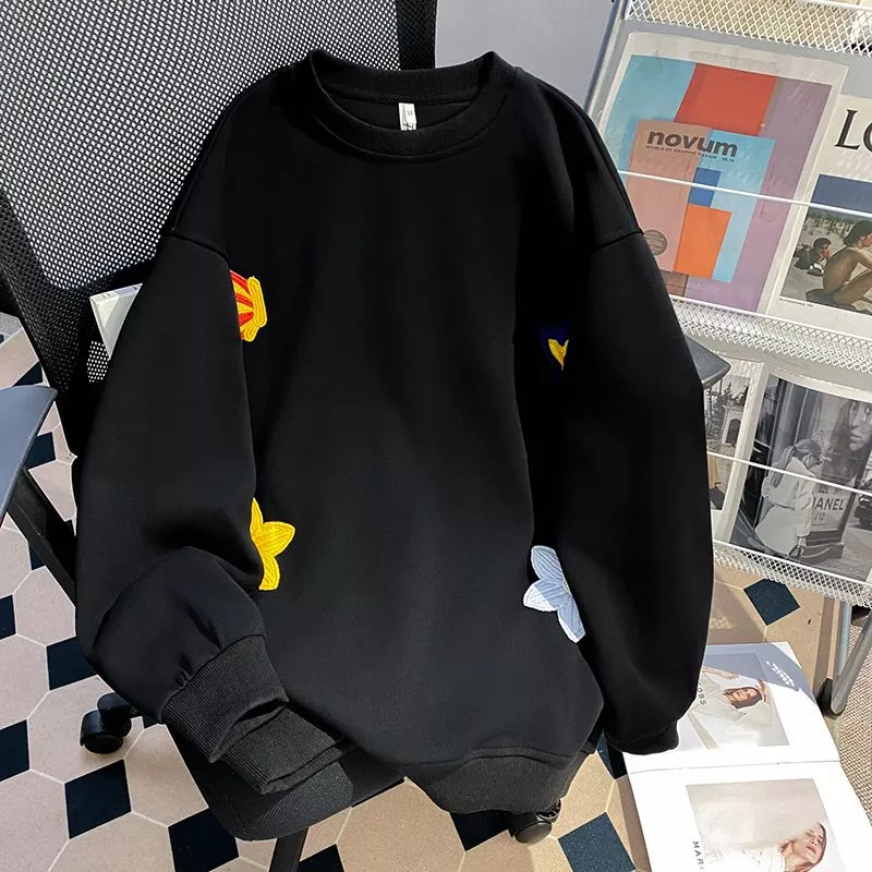 Felpa Nera Morbida Con Fiori Applicati Stile Casual Calda Donna Autunno CF60186