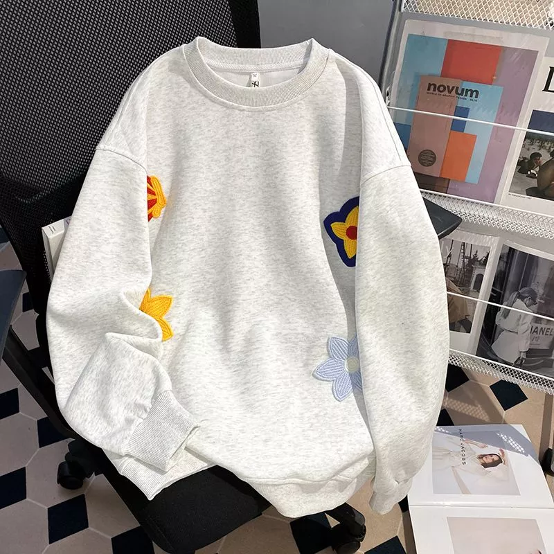 Felpa Grigia Morbida Fiori Applicati Stile Casual Calda Donna Autunno CF60186