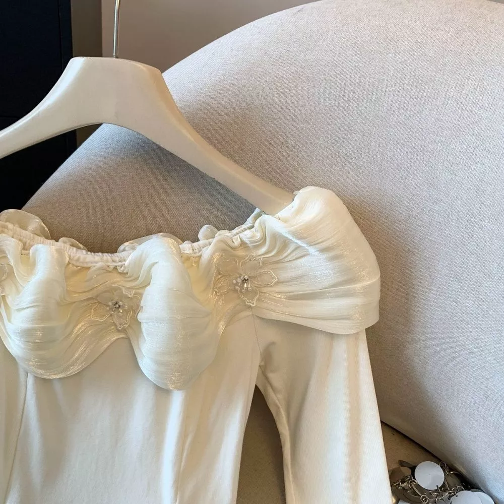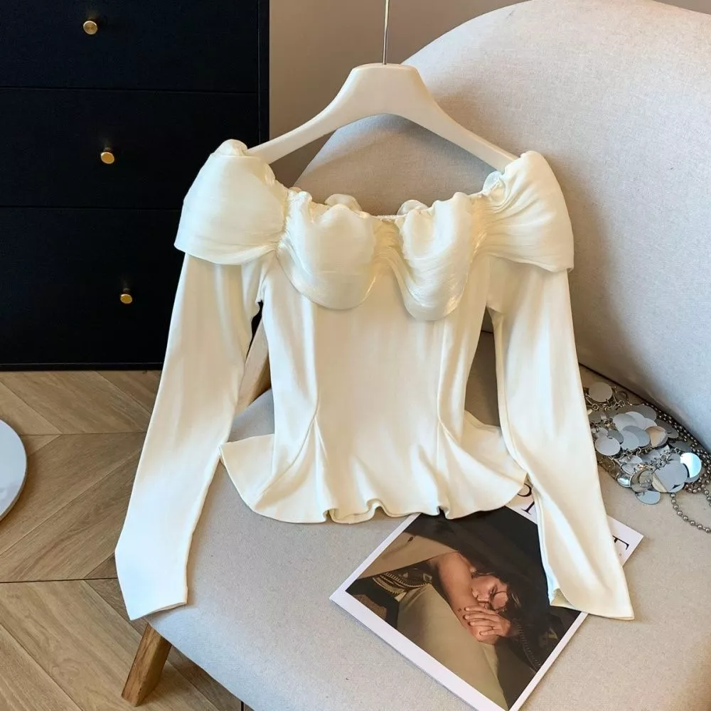 Maglietta donna dal design elegante e femminile, caratterizzata da un raffinato collo bardot con volant decorativi che valorizzano spalle e décolleté con un effetto sofisticato. Il taglio leggermente svasato sul fondo accompagna la silhouette creando una linea armoniosa e slanciata. Un capo ideale per look curati da giorno o da sera, perfetto da abbinare a gonne, pantaloni eleganti o denim per uno stile ricercato ma versatile.
