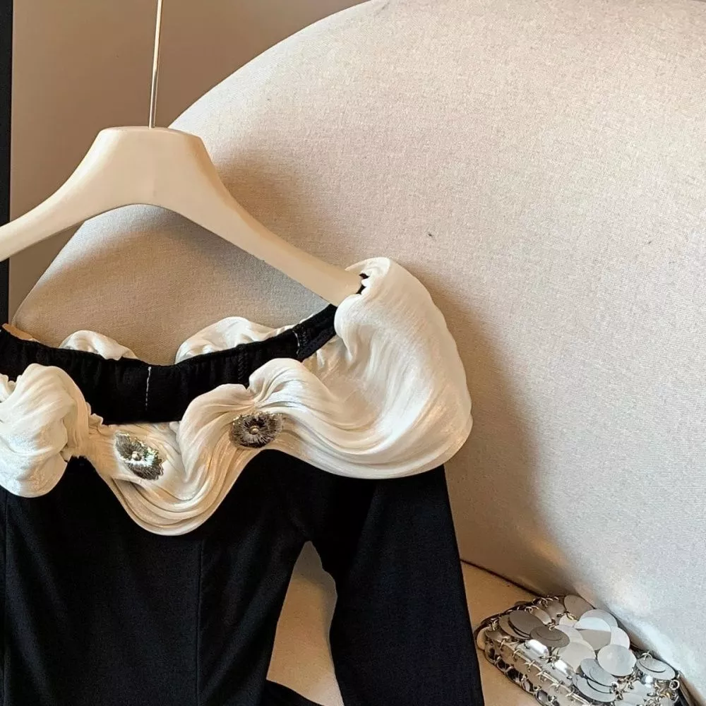 Maglietta donna elegante dal design raffinato e femminile, caratterizzata da una linea sagomata che valorizza la figura. Il modello presenta un ampio collo bardot arricchito da volant decorativi ispirati alla forma della foglia di loto, impreziositi da dettagli applicati che donano luminosità al capo.