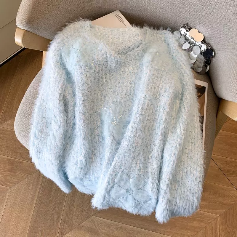 Maglione Azzurro Morbido Con Fiori Applicati Elegante Scollatura Soffice CF59724