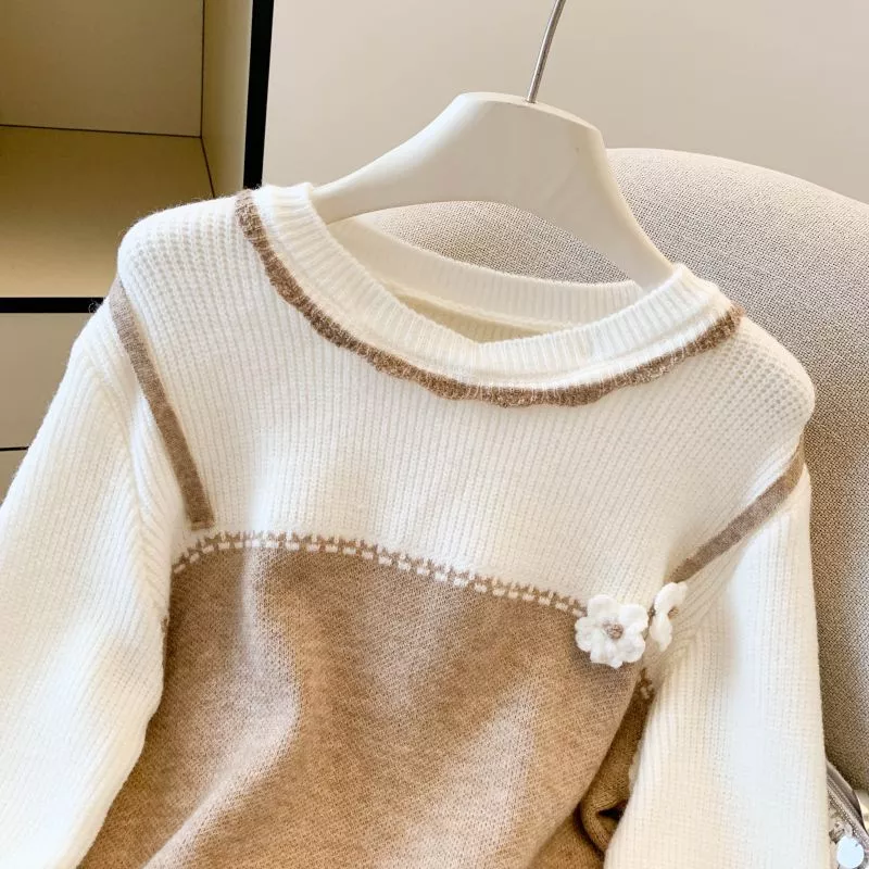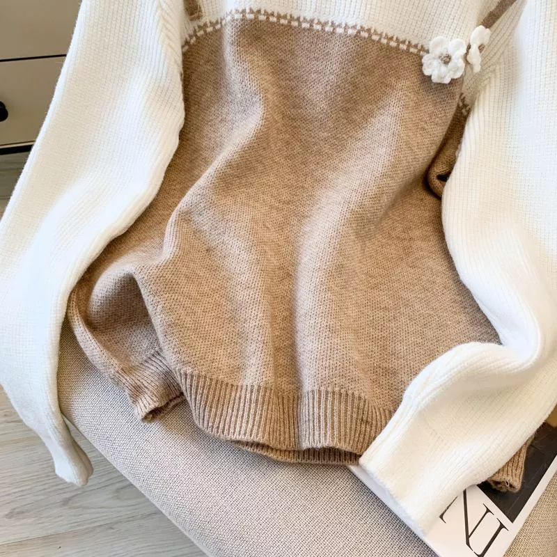 Questo maglione bicolore unisce una linea morbida e confortevole a un dettaglio decorativo femminile grazie al fiore applicato sul petto. La parte superiore in tono panna crea un contrasto delicato con il colore della base, rendendo il capo luminoso e facilmente abbinabile. Il girocollo classico e la maglia soffice lo rendono ideale per l'inverno, perfetto per look casual curati, outfit quotidiani o combinazioni più ricercate. L'effetto pseudo-due pezzi dona originalità senza rinunciare alla comodità.