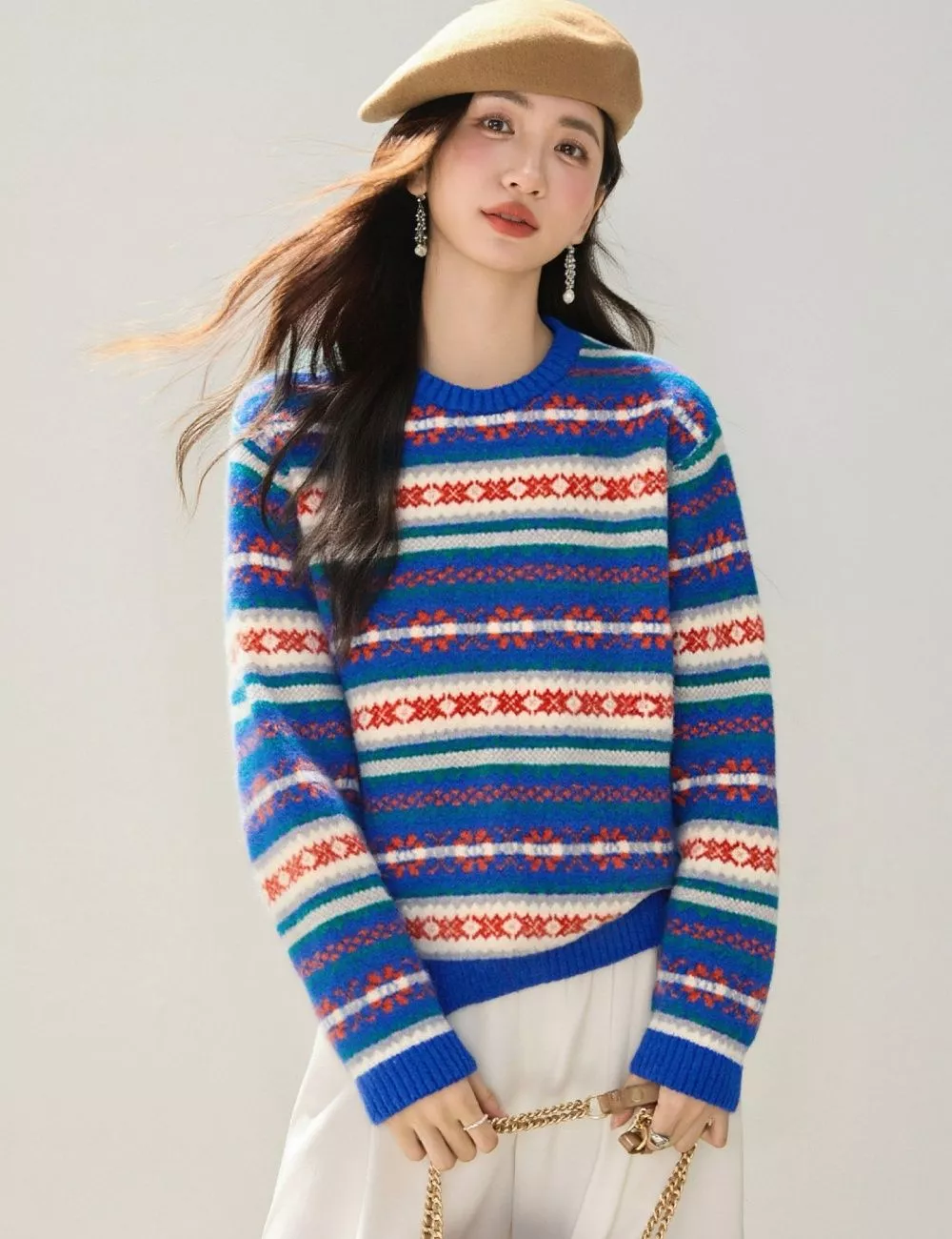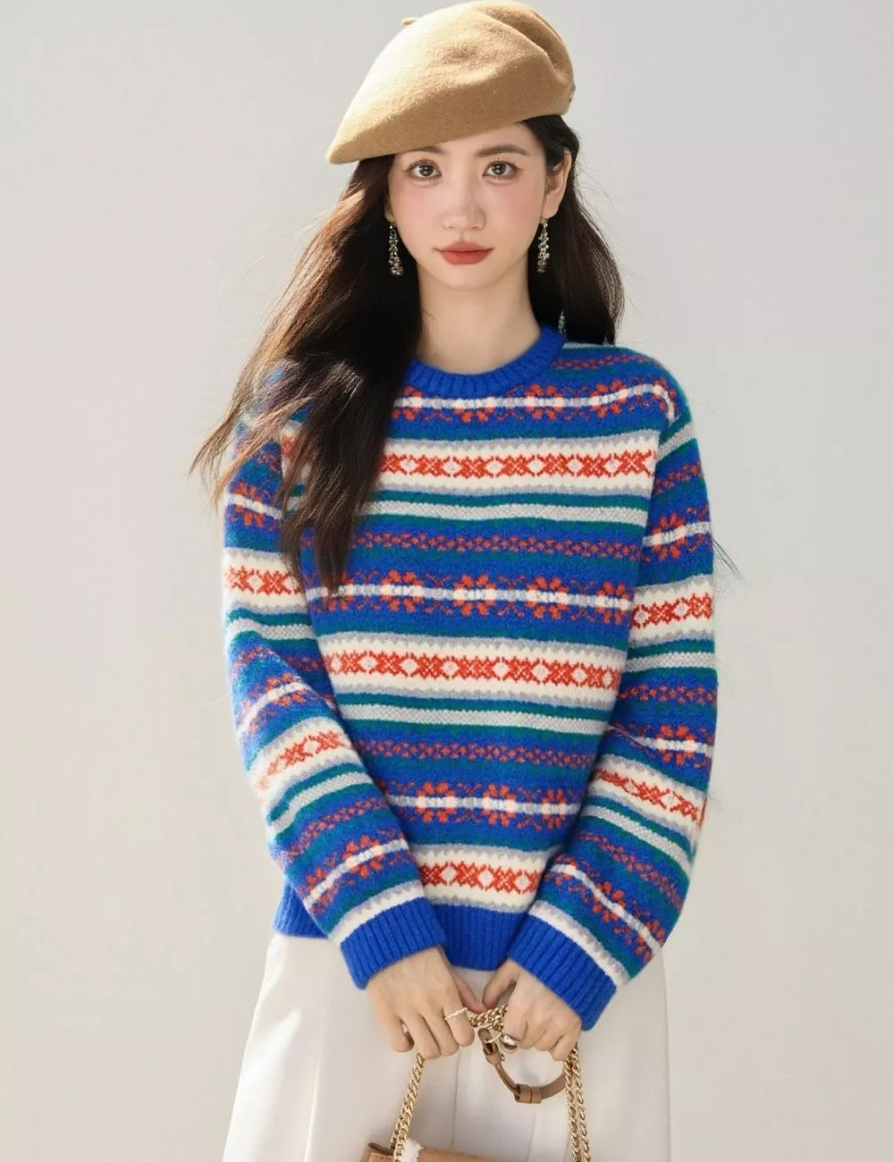Maglione morbido a righe dal carattere retrò, ideale per creare outfit casual e rilassati. Il design colorato dona un tocco vivace al look, mentre la linea comoda permette di indossarlo facilmente tutti i giorni. Perfetto con jeans, gonne e pantaloni a vita alta. La texture soffice e confortevole lo rende un capo versatile per la stagione fredda, adatto sia al tempo libero che agli abbinamenti quotidiani più curati.