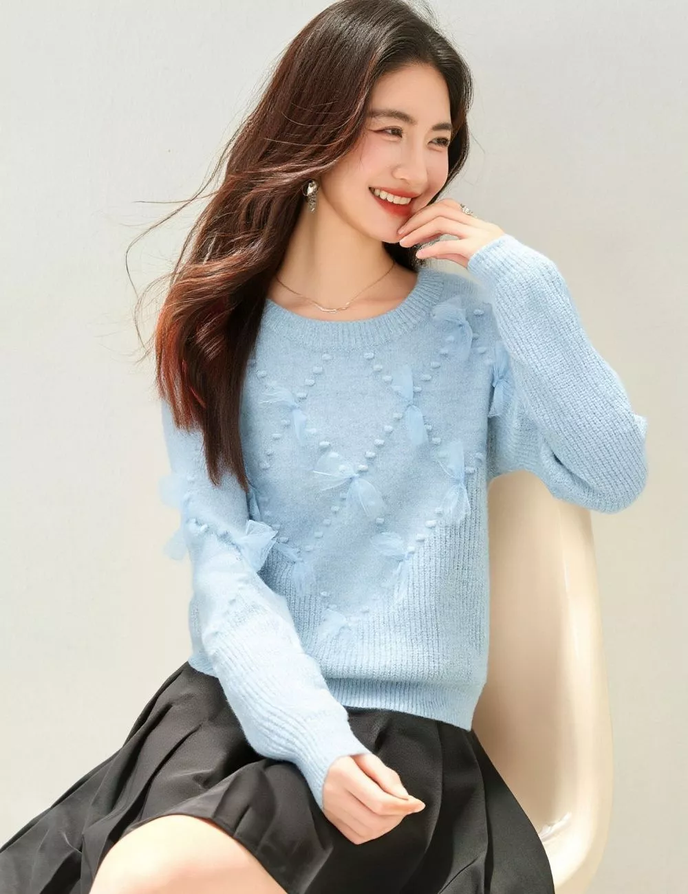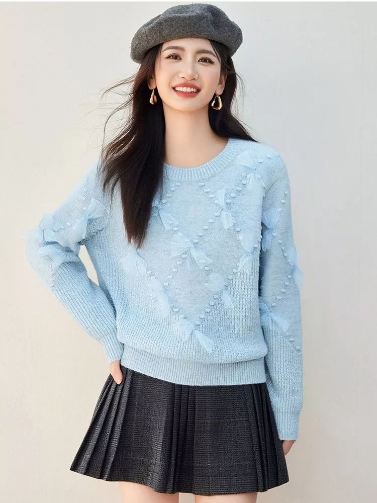 Maglione femminile dall’effetto morbido e avvolgente, impreziosito da piccoli fiocchi applicati che donano un tocco romantico e luminoso al look. La texture soffice valorizza ogni outfit quotidiano, mentre il taglio a girocollo mantiene un’estetica moderna e versatile. Perfetto da abbinare sia a gonne che a jeans per creare uno stile curato, elegante e confortevole nelle giornate più fresche.