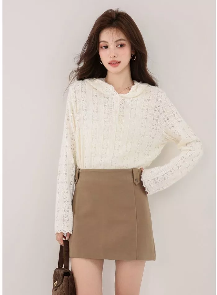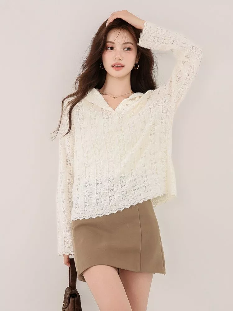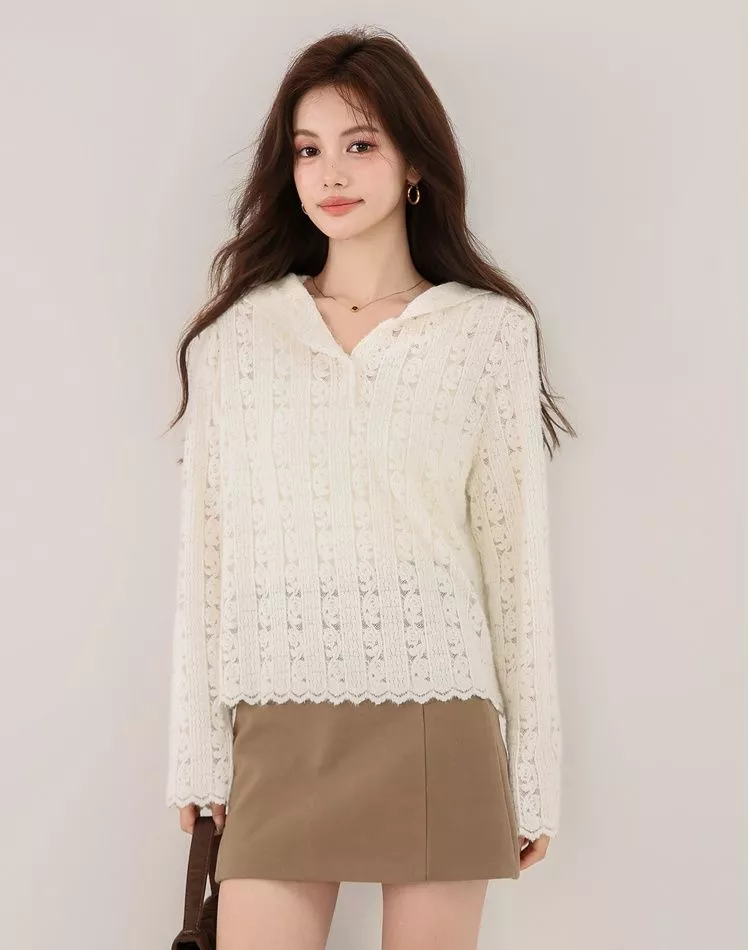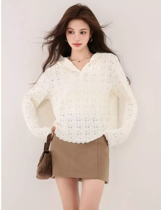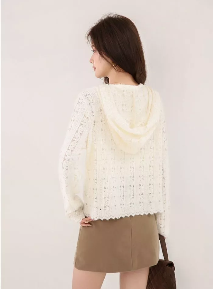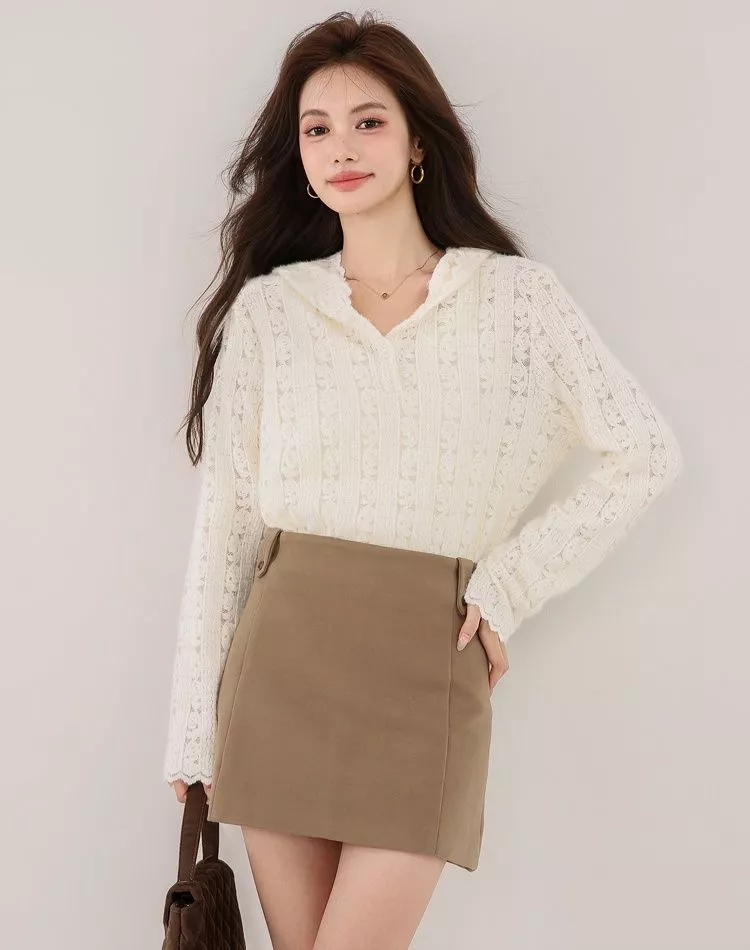Maglione con cappuccio lavorato a maglia in tonalità albicocca, dal design morbido e confortevole. Lo scollo a V e le finiture delicate aggiungono un tocco femminile, mentre la lavorazione a trecce regala movimento e stile. Perfetto per completare look quotidiani con jeans, gonne o pantaloni eleganti.