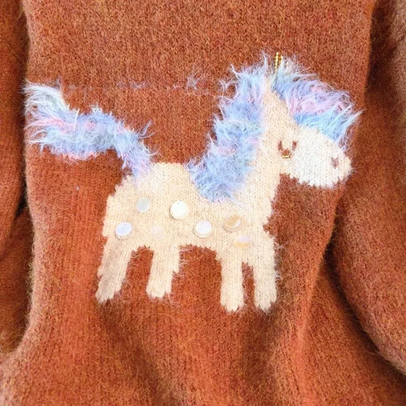 Maglione da donna dal carattere originale e giocoso, pensato per la stagione autunnale e invernale. Il design si distingue per la presenza dell'unicorno decorativo centrale, arricchito da dettagli applicati che donano luminosità e rendono il capo unico nel suo genere.