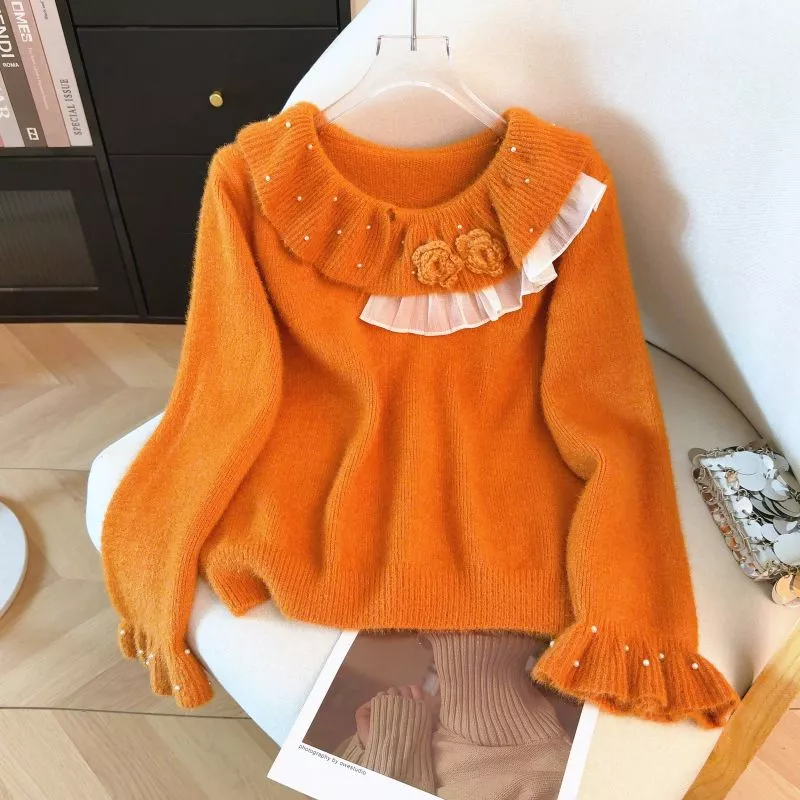 Maglione Donna Arancione A Maglia Con Collo A Volant E Fiori Decorativi CF64772