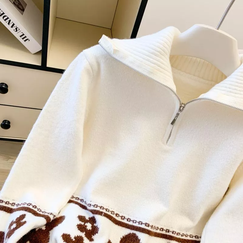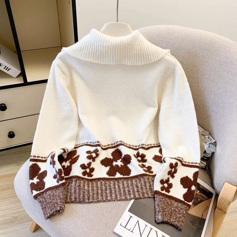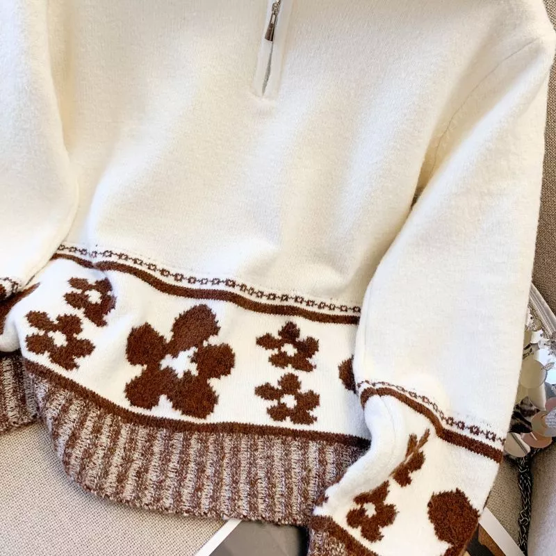 Maglione morbido e caldo, ideale per look casual femminili ben curati. Il design con fiori a contrasto dona un tocco moderno e valorizza la linea senza appesantire, mentre il collo con zip aggiunge versatilità e un’aria raffinata. Il taglio è comodo, pensato per un utilizzo quotidiano, con resa piacevole anche negli outfit layered. Perfetto per chi desidera un capo soffice, accogliente e facile da abbinare nelle giornate fresche.