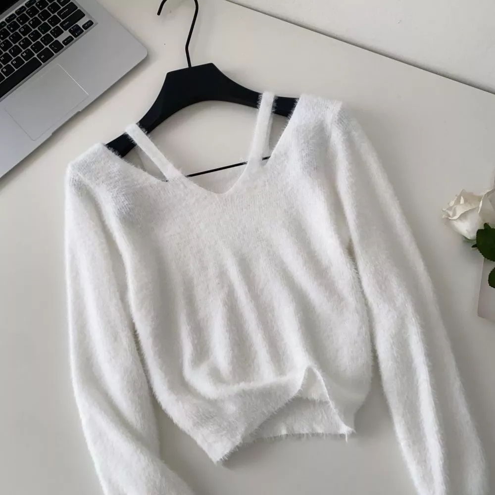 Maglione Donna Corto Con Scollo A V E Spalline Sottili Elegante Bianco CF65335