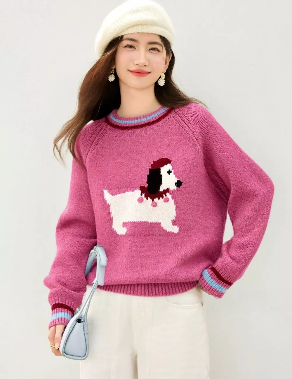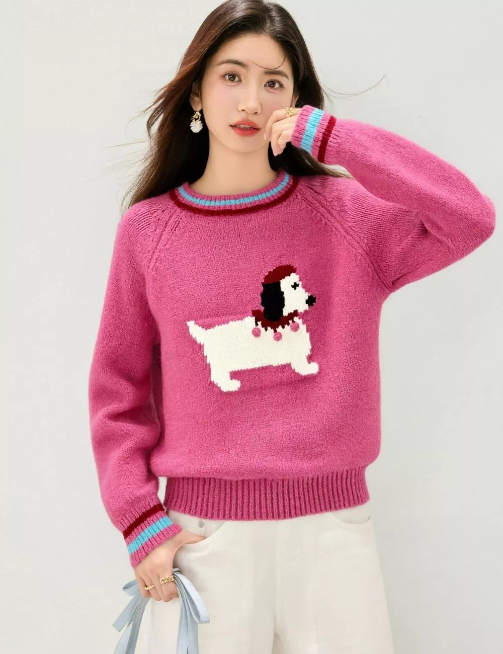 Maglione Donna Rosa Con Motivo Cane Maniche Lunghe Vestibilità Morbida CF62079