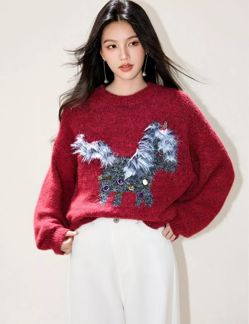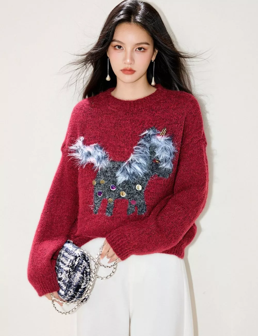 Maglione da donna dal carattere deciso e decorativo, caratterizzato da una base rosso intenso e da un ricamo centrale figurativo arricchito da dettagli piumati applicati. Il capo si distingue per l’effetto visivo tridimensionale della decorazione, che crea contrasto materico e rende il maglione protagonista dell’outfit.