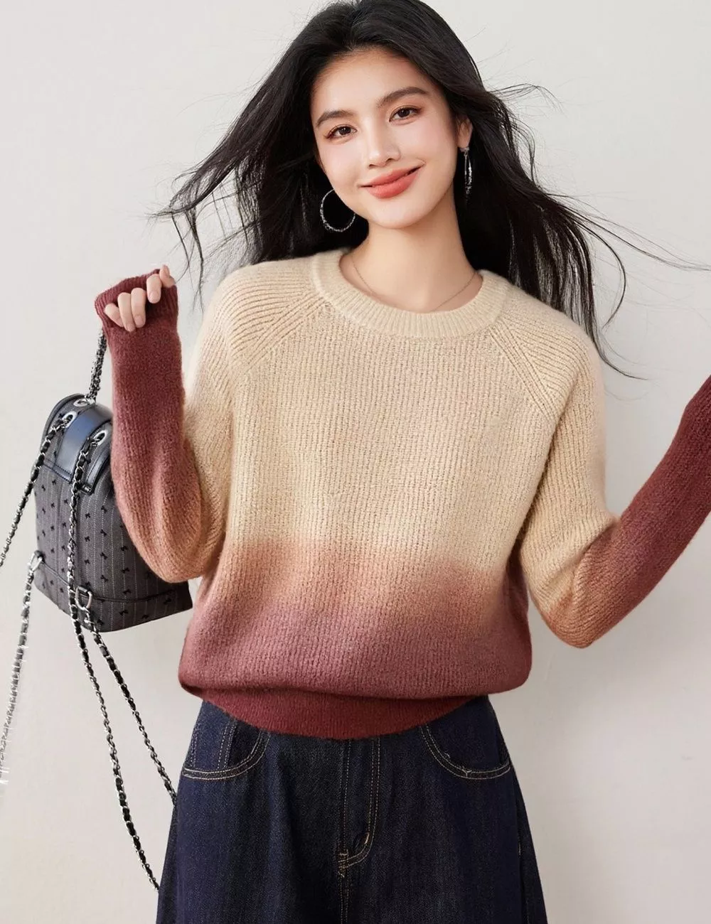Maglione donna a maglia dal design pulito ed elegante, caratterizzato da una raffinata sfumatura cromatica che passa gradualmente dal beige chiaro al marrone caldo. La lavorazione uniforme e la vestibilità morbida rendono il capo confortevole e versatile, ideale per look quotidiani curati.
