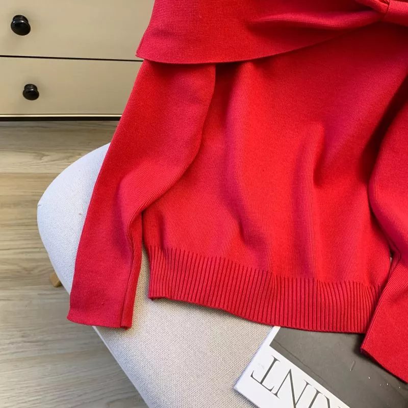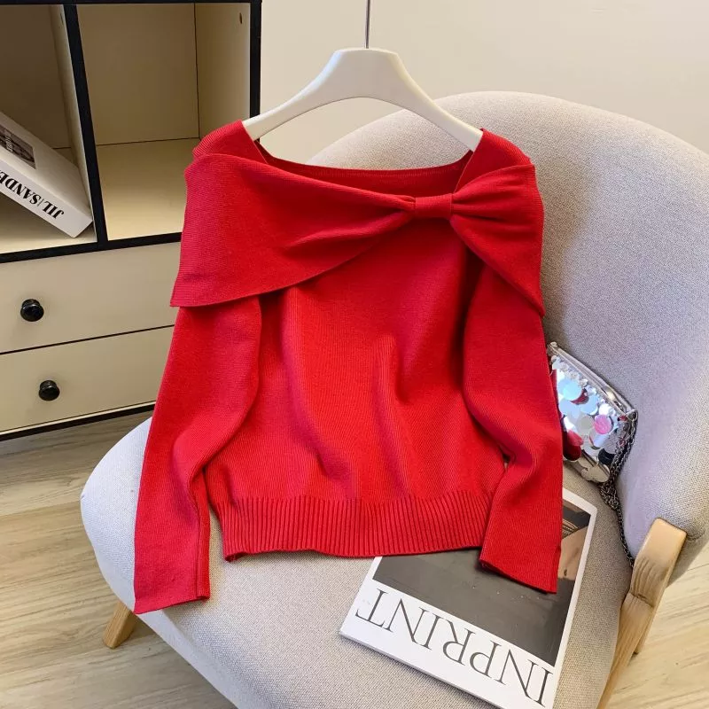 Maglione Elegante Fiocco Grande Rosso Scollatura Ampia Moda Femminile CF60571