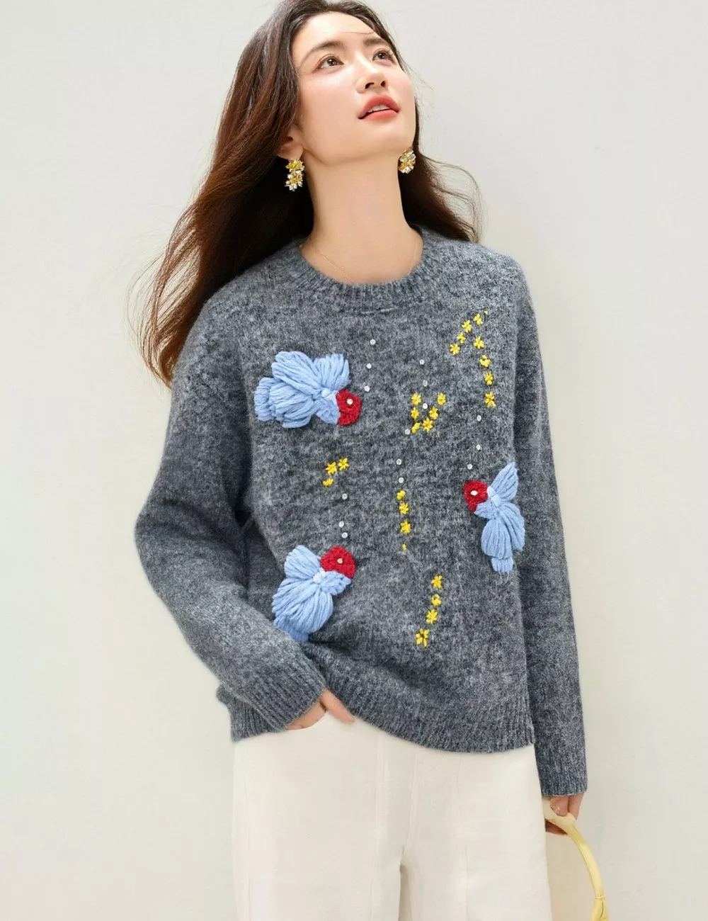 Maglione Morbido Ricamato Chic Con Pesci Decorativi Grigio Look Casual CF60374