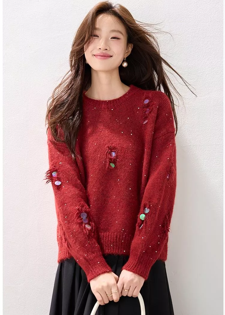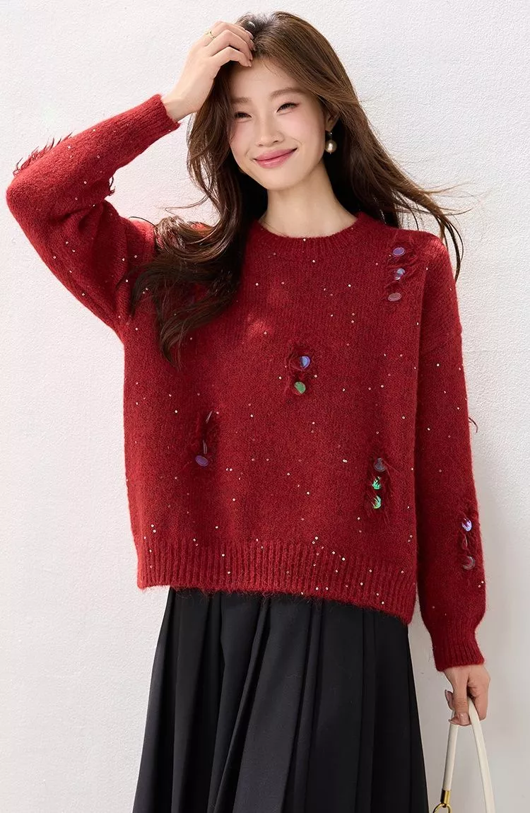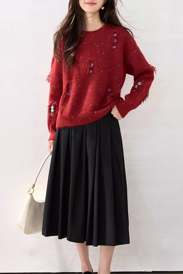 Questo maglione rosso unisce morbidezza e stile in un modello ricco di applicazioni decorative che donano un leggero effetto luminoso, ideale per valorizzare gli outfit di tutti i giorni con un tocco speciale. La vestibilità confortevole e il taglio leggermente rilassato lo rendono perfetto per look casual curati, mentre le decorazioni distribuite sul davanti e sulle maniche aggiungono personalità e femminilità. Facile da abbinare a gonne midi, pantaloni palazzo o jeans scuri, è un capo versatile che illumina immediatamente l’intero outfit.