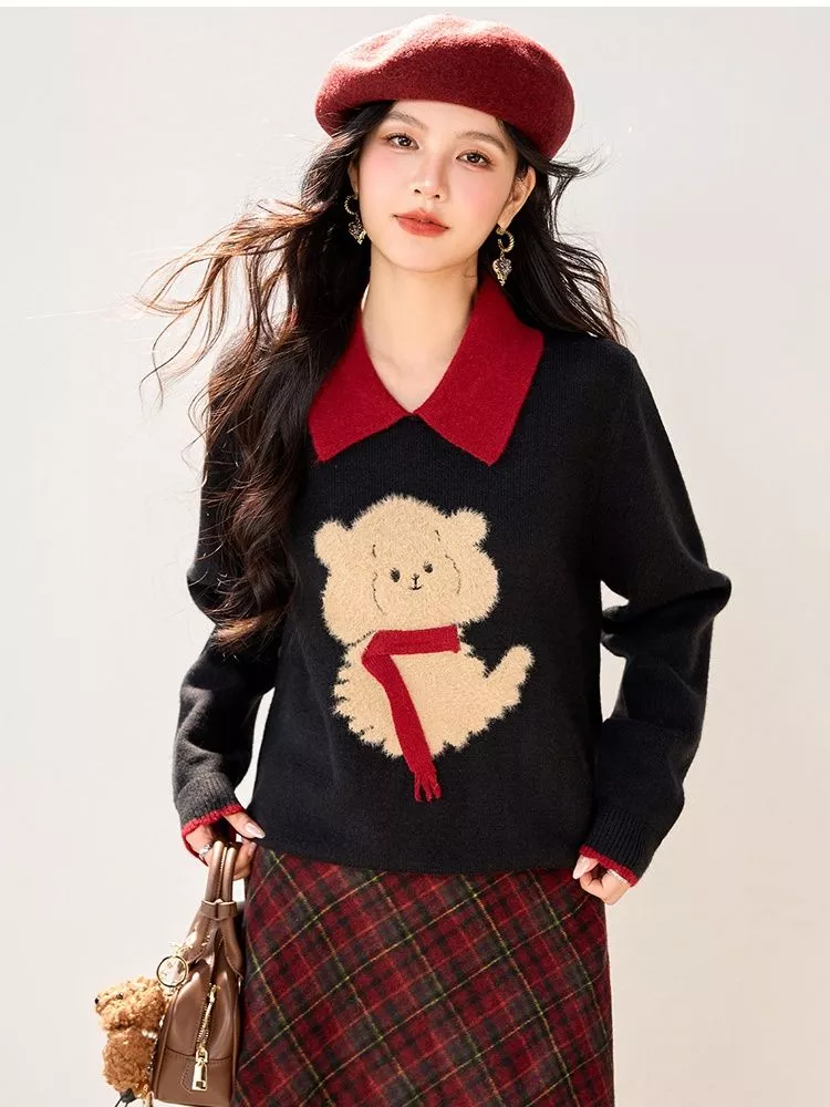 Maglione Nero Morbido Con Orsetto Ricamato Stile Romantico Look Casual CF60363
