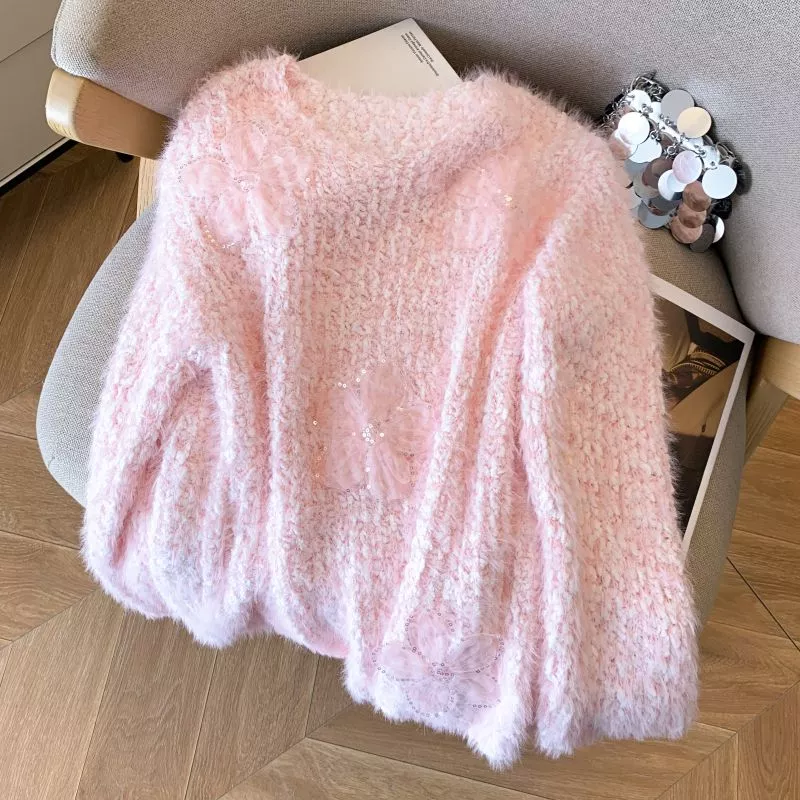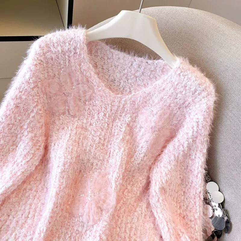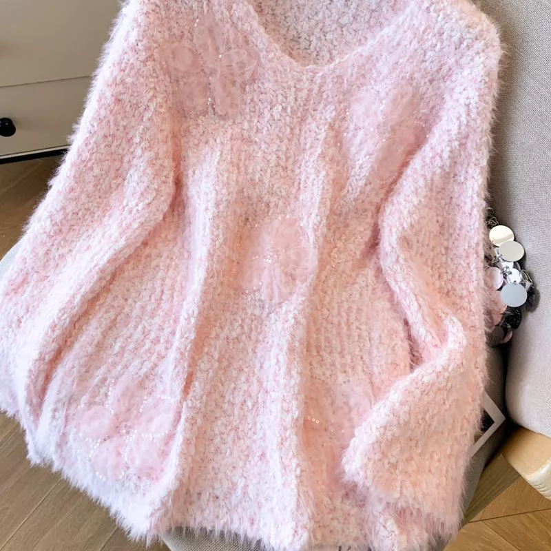Maglione morbido con effetto soffice e applicazioni floreali tono su tono che aggiungono un tocco romantico e luminoso. La scollatura a V valorizza il décolleté e rende il modello facile da abbinare, mentre il tessuto peloso assicura calore e morbidezza.