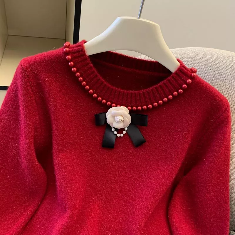 Maglione Rosso Perle Fiocco Ricamato Morbido Caldo Donna Look Raffinato CF59046