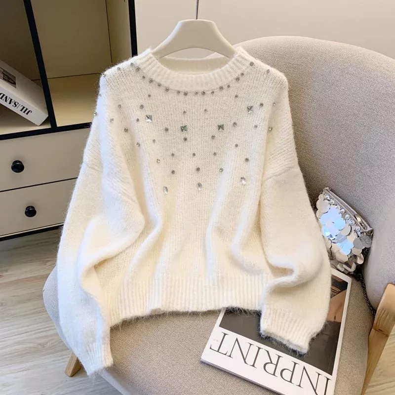 Maglione Bianco Strass Luminosi Morbido Caldo Chic Donna Look Elegante CF59042