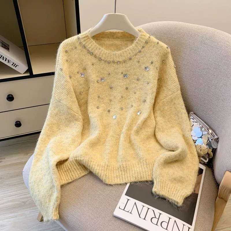 Maglione Giallo Strass Brillanti Morbido Caldo Donna Look Casual Chic CF59042