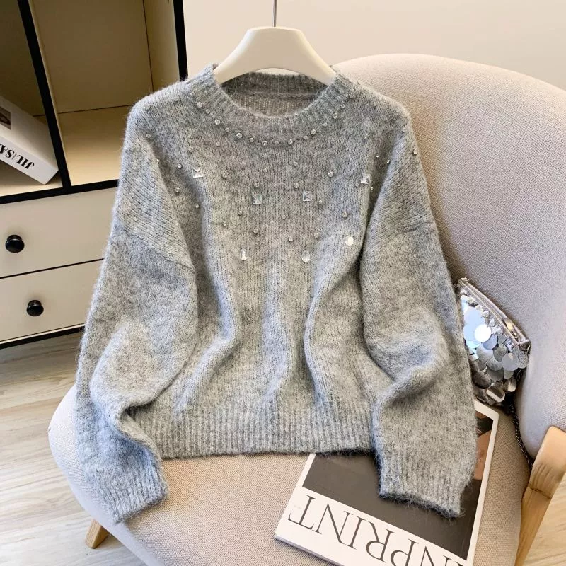 Maglione Grigio Strass Eleganti Morbido Caldo Donna Look Casual Trendy CF59042