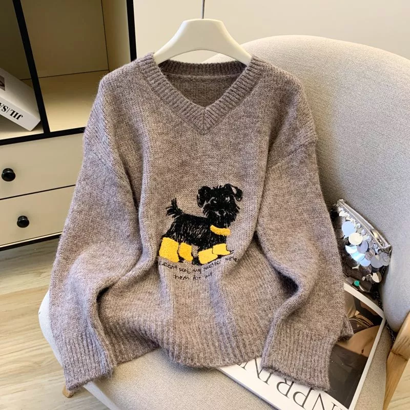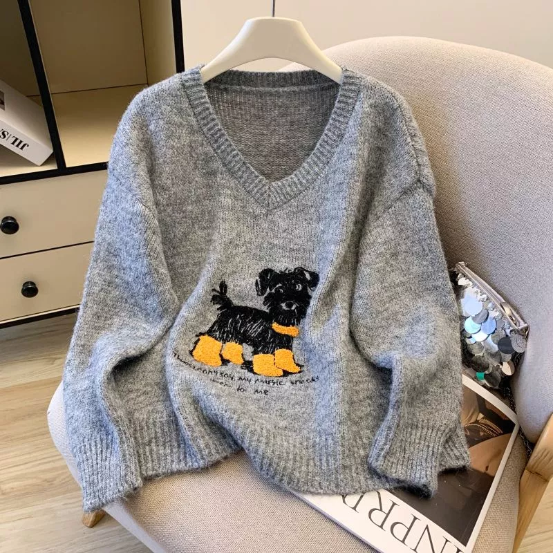 Maglione Grigio Ricamo Cagnolino Morbido Caldo Donna Look Casual Chic CF59044