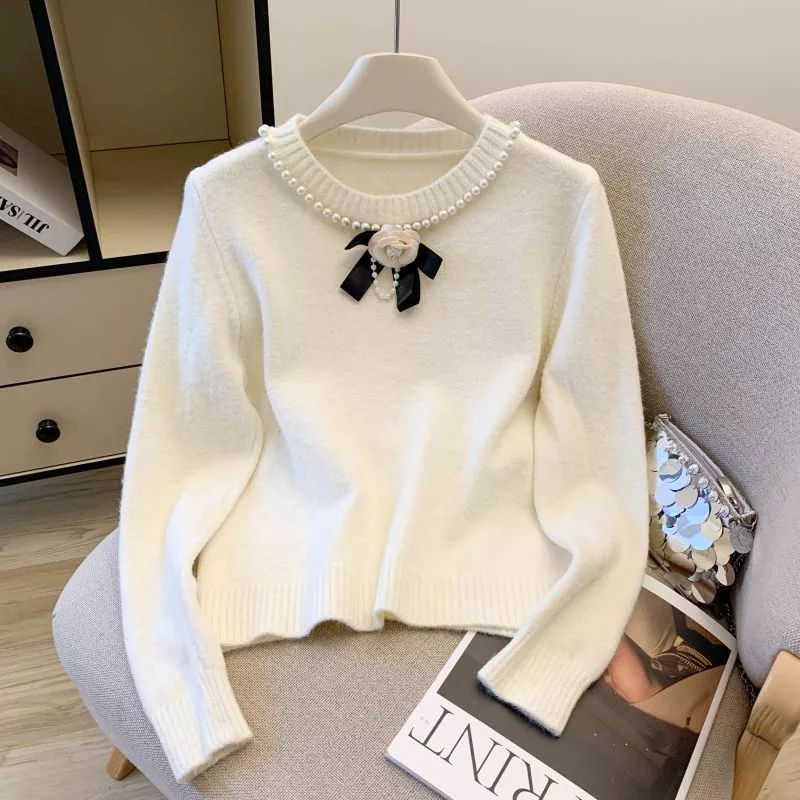 Maglione Bianco Perle Fiocco Ricamato Morbido Caldo Donna Stile Elegante CF59046