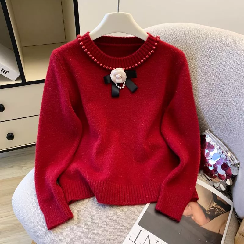 Maglione Rosso Perle Fiocco Ricamato Morbido Caldo Donna Look Raffinato CF59046