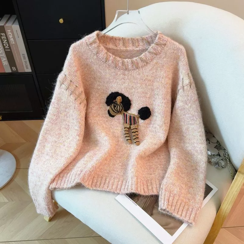 Maglione Morbido Albicocca Ricamo Cagnolino Stile Casual Caldo Inverno CF59732