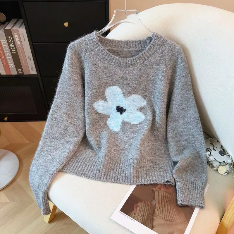 Maglione Caldo Grigio Chiaro Con Fiore Applicato Casual Morbido Inverno CF59733