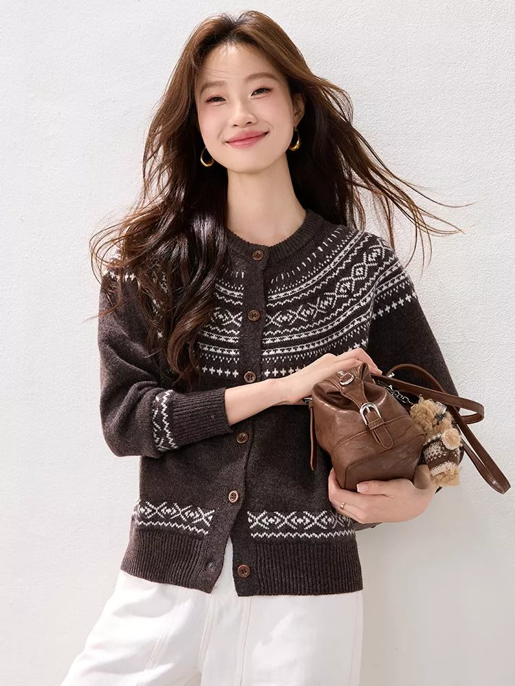 Cardigan Marrone Jacquard Invernale Stile Caldo Elegante Donna Bottoni CF60076