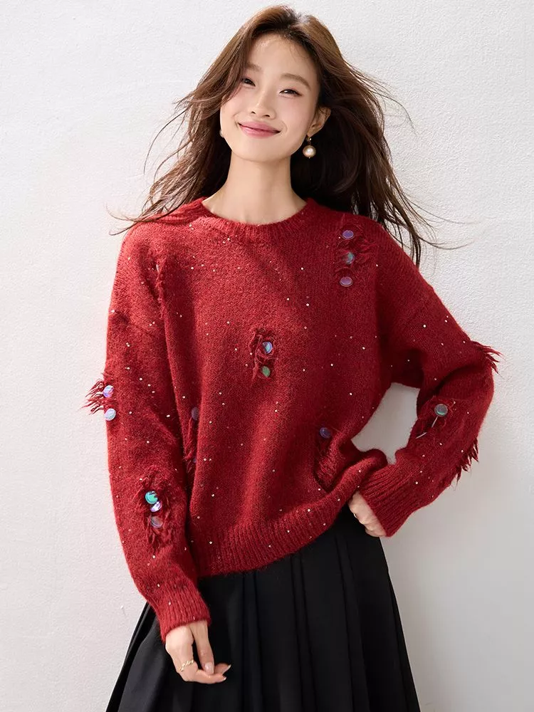 Maglione Morbido Rosso Con Applicazioni Elegante Effetto Luminoso Donna CF60078