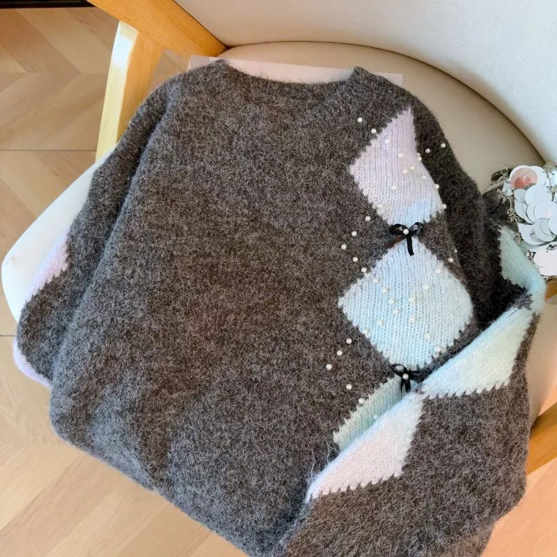Maglione Morbido Con Rombo Decorato Perle Fiocco Grigio Invernale CF60894