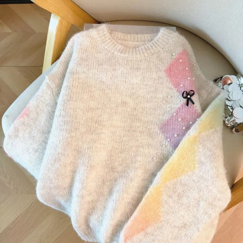 Maglione Morbido Con Rombo Decorato Perle Fiocco Albicocca Invernale CF60894