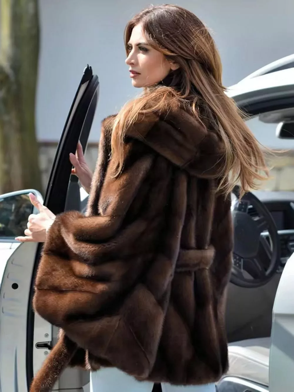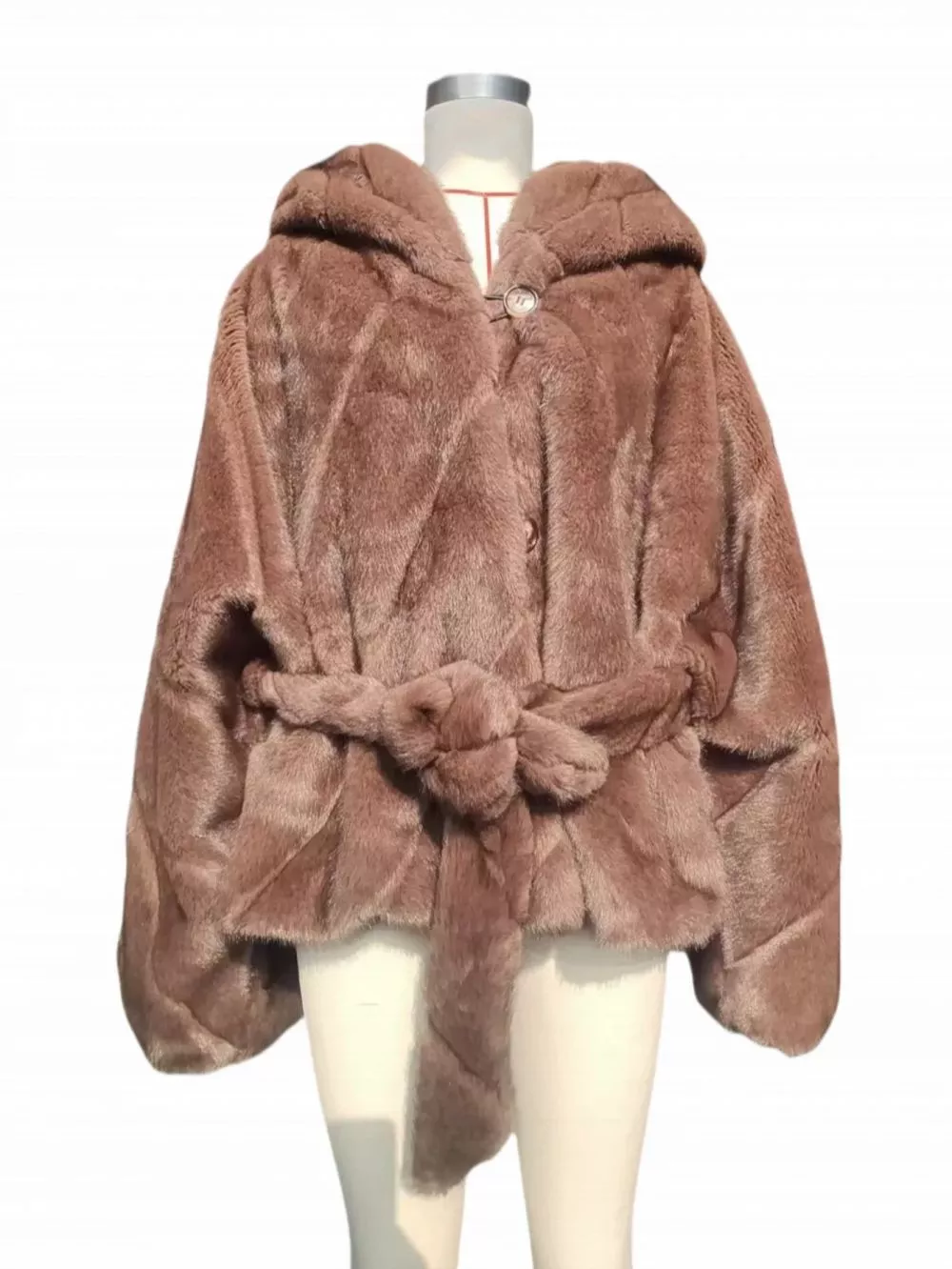 Mantella In Pelliccia Ecologica Con Cappuccio E Cintura Marrone Elegantee 33676