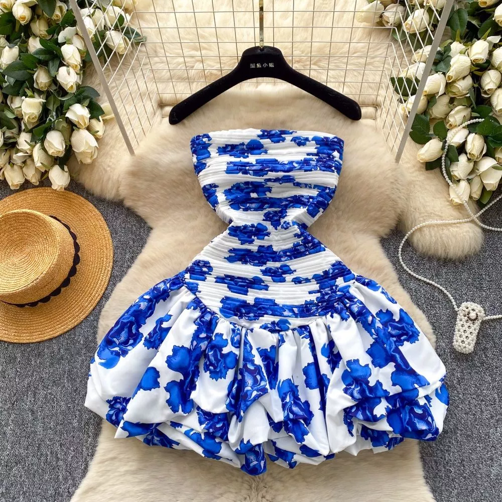 Abito Donna Corto Bianco Con Fiori Blu Senza Spalline A Balze Elegante CF64127