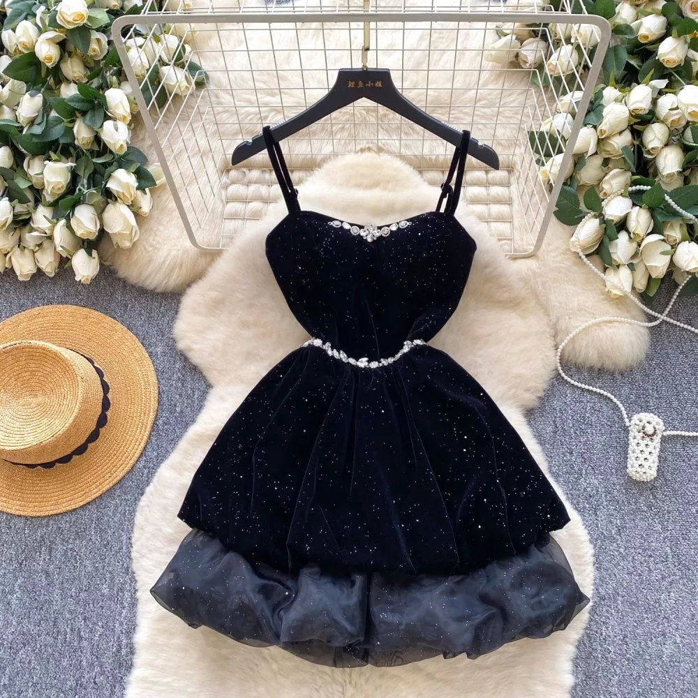 Abito Elegante Nero Con Spalline E Gonna In Tulle Con Dettagli Gioiello CF64911