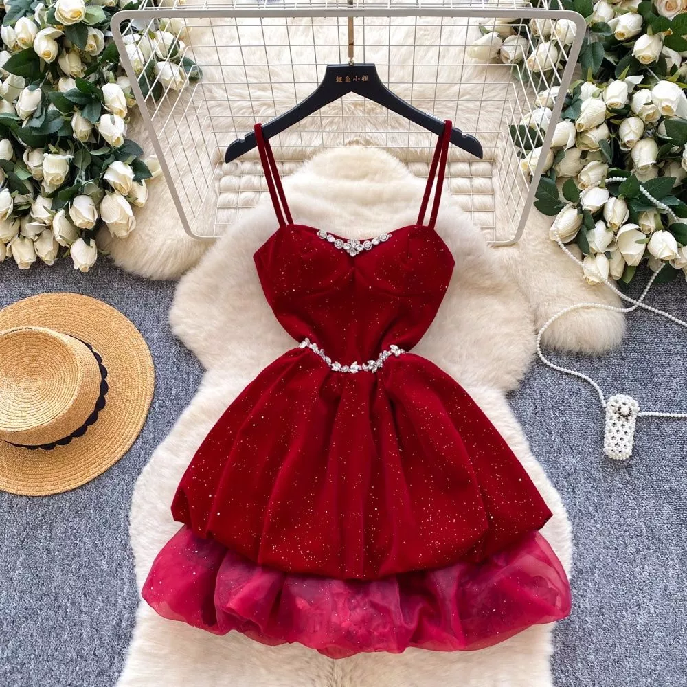 Abito Elegante Rosso Con Sottili E Gonna In Tulle Con Dettagli Gioiello CF64911