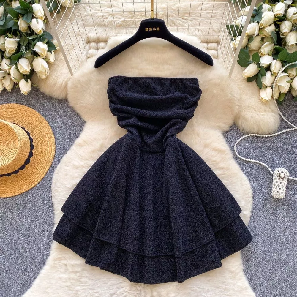 Abito Mini A Fascia Donna Nero In Maglia Elasticizzata Con Gonna Svasata CF64925