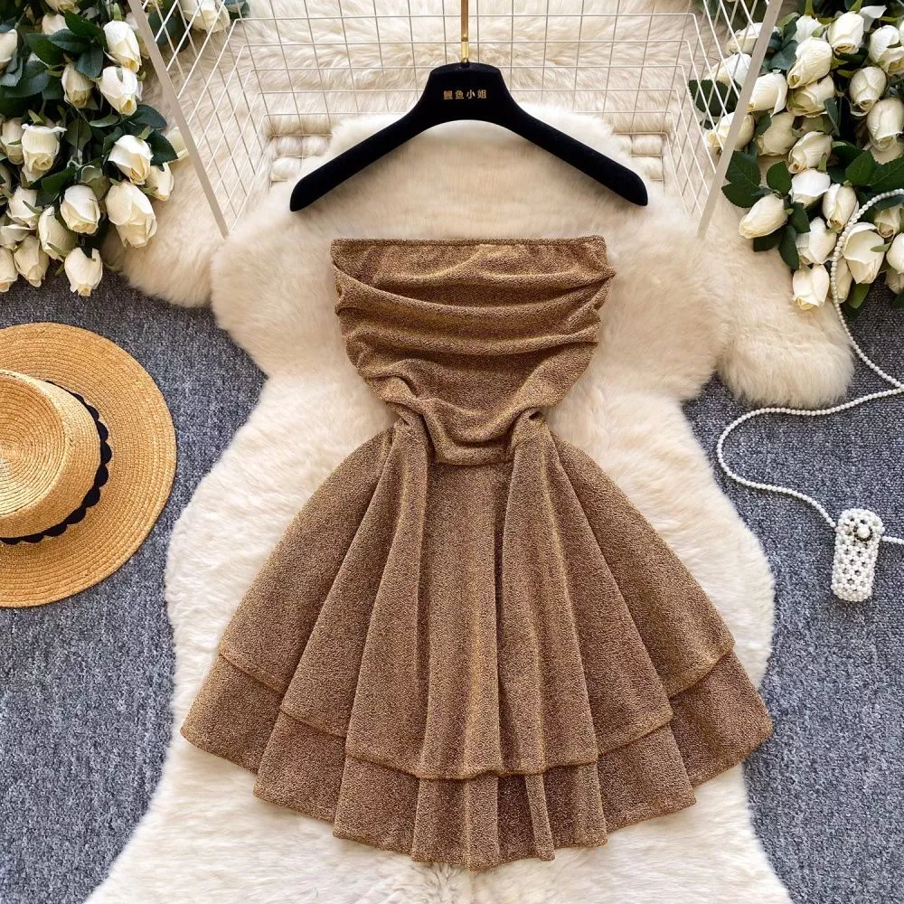 Abito Mini A Fascia Donna Oro In Maglia Elasticizzata Linea Svasata CF64925