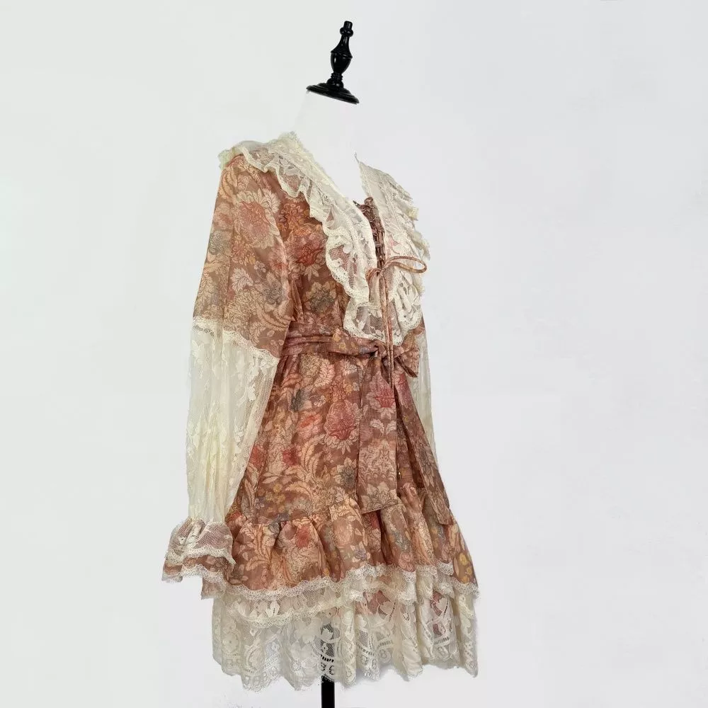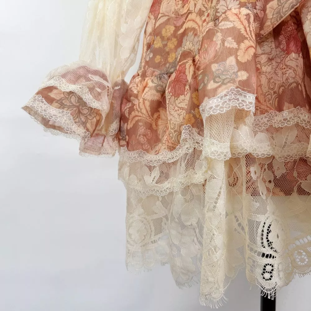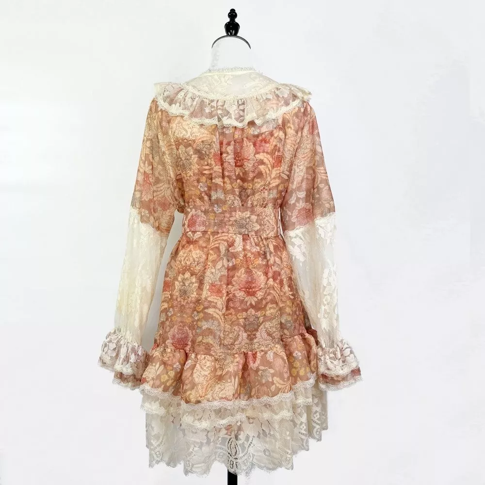 Mini vestito donna dallo stile romantico e ricercato, caratterizzato da una delicata fantasia floreale arricchita da inserti in pizzo e dettagli a balze. Il modello presenta una linea femminile con vita regolabile che valorizza la silhouette mantenendo comfort e leggerezza. Le maniche lunghe semitrasparenti e la lunghezza corta con orlo in pizzo donano movimento e raffinatezza, rendendo il vestito ideale per occasioni speciali, eventi diurni e look curati dal gusto elegante.