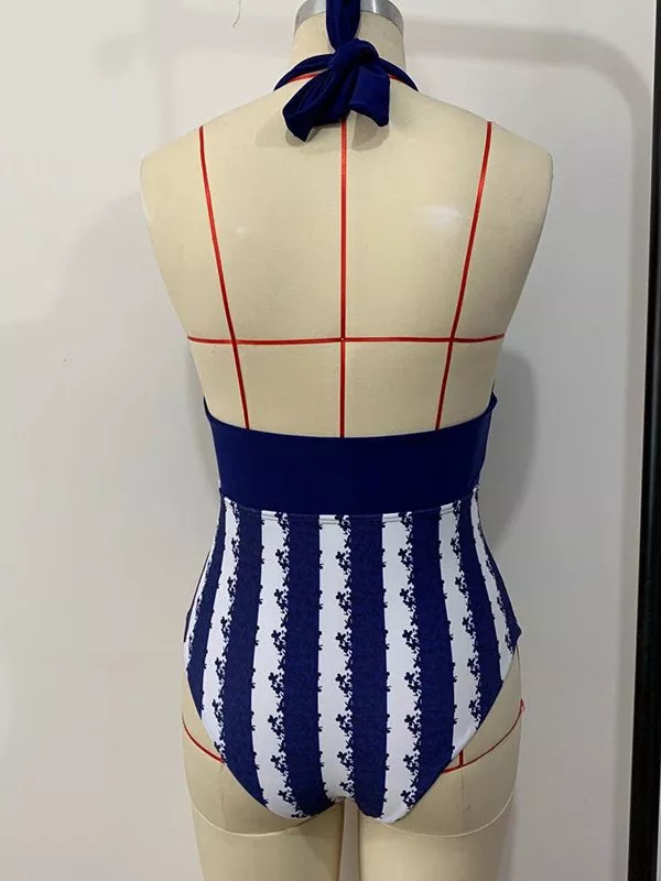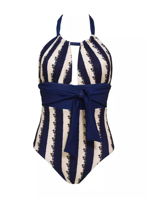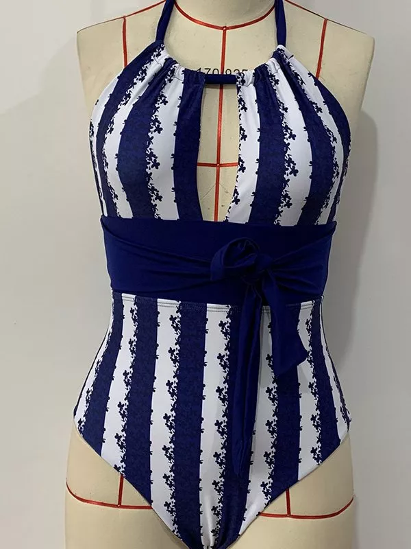 moda mare costume intero elegante monokini elegante blu bianco cintura 52711