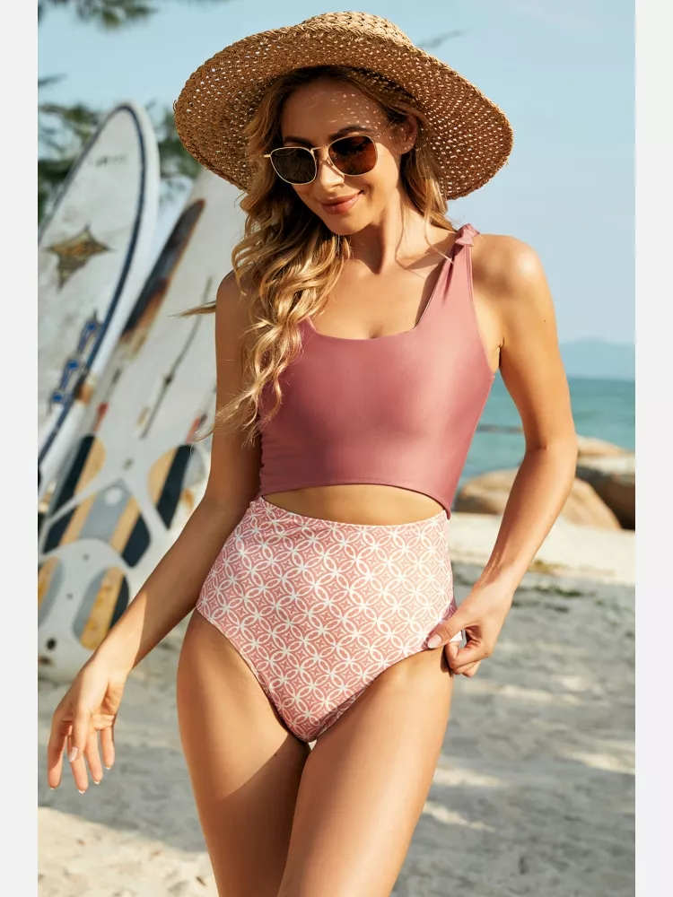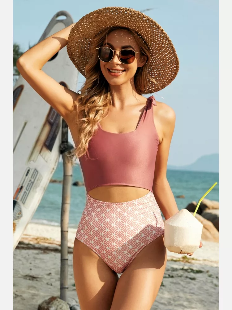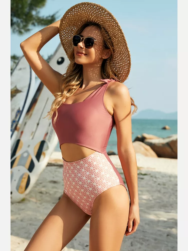moda mare costume intero monokini donna rosa scollato perforato slim 30529