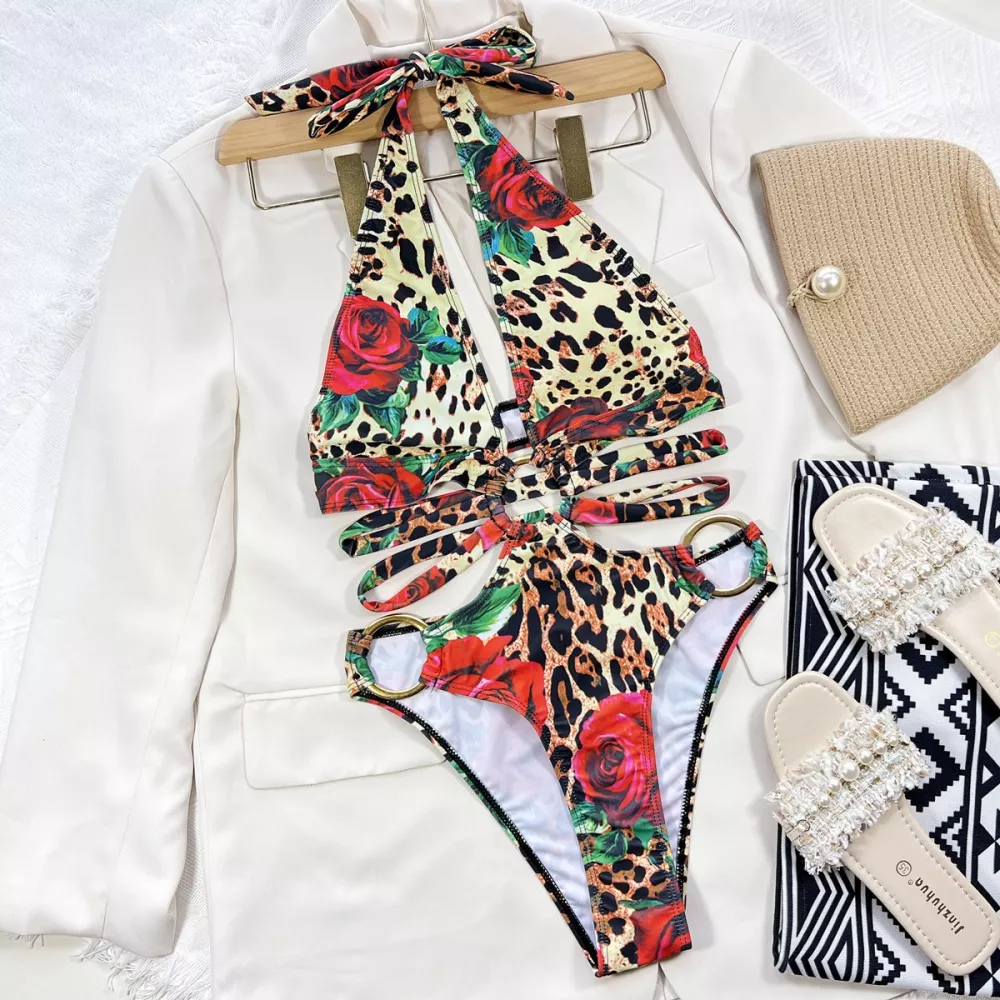 moda mare costume intero monokini elegante beige animalier sexy scollato 30766
