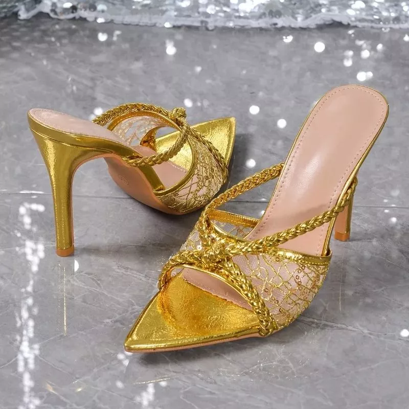 Mule Donna Eleganti Tacco Alto Scarpe Oro Rete e Intreccio da Cerimonia CF70692